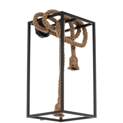 Lights.co2-bulb designer wall light Vlados with cage-frame construction and two light-coloured hemp ropes Vlados has vintage qualities and impresses with its exclusive look. Instead of a lampshade, an angular frame made of black steel is used here, which is also fitted with two hemp ropes that lead from the power outlet to the sockets and create a visually appealing contrast. They can be wrapped around the frame as desired, allowing for a more individualised design of light and appearance. As the two lamps are a more prominent feature, the bulbs should also be selected so that they fit in well visually. This primarily applies to filament LED bulbs or bulbs with a rustic look, which are usually also quite energy-efficient with their light-emitting diode technology.