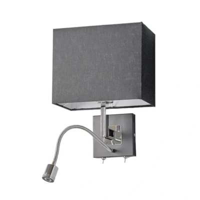 Lamp MastersThe Rebekka Wall Lamp Black/Chrome fulfils many types of needs with its different lighting options. The lamp design consists of a square bracket that holds two different sized light sources. One light source is covered by a square fabric shade in an exclusive dark shade, which ensures a particularly atmospheric glow when the lamp is switched on. The other is a smart reading lamp that is mounted to an adjustable flex arm, allowing you to choose between a diffused supplementary light for the room or a focussed light for working or reading. The two light sources can be operated independently of each other via two switches on the frame. For the shielded light source, it is recommended to use a power-saving LED light bulb. The light is emitted indirectly through the lampshade and directly out through the openings at each end of the lampshade, giving the light a beautiful two-part character when reflected onto the wall.