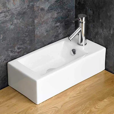 The Lucca White Ceramic Narrow Rectangular Right Hand Basin is perfect for small bathrooms, cloakrooms, and ensuites. With a width of 510mm and a depth of 255mm, it fits snugly into corners or against straight walls. This countertop basin mounts effortlessly on any wall or flat surface, including slimline vanity units, as long as there's room for plumbing underneath. It features a right-hand tap hole and an internal overflow, making it compatible with slotted wastes to prevent accidental spills if the tap is left running. Crafted from durable, long-lasting gloss white ceramic, this basin is both practical and stylish. It enhances the look of your bathroom while maximising functionality. Wall fixings are included for easy installation.. Lucca 500mm White Ceramic Narrow Rectangular Right Hand Basin Clickbasin