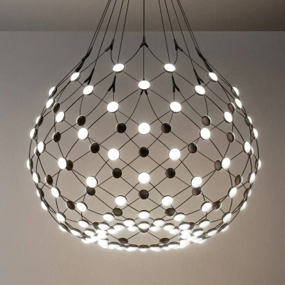 Design hanging light Mesh with LED polycarbonate lenses The LED hanging light Mesh, created by designer Francisco Gomez Paz for the lighting manufacturer Luceplan, which has been combining a creative spirit with efficiency and functional quality through aesthetic and technological research since it was founded in 1978, creates striking room lighting. The result is lighting fixtures with high standards of design and functionality that also have a high decorative value when unlit. Mesh, for which Francisco Gomez Paz was honoured with the Red Dot "Best of the Best" Design Award in 2016, consists of a network of interconnected cables. LEDs are installed in round plastic lenses at the intersections. They emit a very atmospheric light. The large number of light sources used guarantees all-round lighting that is ideal for basic or area lighting - dimmable via the house installation