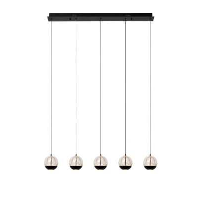 Sentubal is not just any pendant light - it is a pendant light designed to create an experience. With its modern and luxurious design, it is guaranteed to be the focal point of your interior. Five pendants descend in a straight line from the ceiling plate. You can adjust the height of each pendant from 70 to 150 centimetres. A spherical lampshade made of high-quality glass is attached to the elegant steel cables. The bold details create a strong contrast. On the inside you will find a built-in LED bulb that provides a warm white light. By connecting this pendant to a dimmer, you can add atmosphere to any room in the house. Unique product features: • With integrated dimmable LED light sources • Fitted with warm white light (2700K) • This lamp is adjustable in height • Easy to connect to a dimmer (excl.) • Made of high quality glass Important product features: • Energy consumption: 5x5,3W / 230V / Dimmable (incl.) • Dimensions: L.95 x W.11 x H.150 cm • 3 Years warranty on the fixture