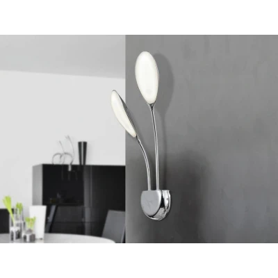 LED wall lamp, made of aluminium and chromed metal. Polycarbonated opal diffuser. 2 LED lights of 5,3W. 742 lm. 4000K