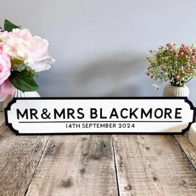 PERSONALISED SIGN - Make your wedding day truly unique with this Personalised Wedding Road Sign, designed to feature your family name or a custom message. Inspired by classic street signs, this charming decoration is perfect for adding a personalised touch to your wedding venue. Whether used to welcome guests, direct them to different areas, or as a unique photo prop, this custom sign adds both style and function to your big day. WEDDING DECOR- Crafted from 3mm thick acrylic. The customisable text allows you to create a sign that fits perfectly with your wedding theme, adding a special, memorable detail to your celebration. After the event, it becomes a cherished keepsake, perfect for displaying in your home. MEASUREMENTS - 3mm acrylic and the sign measures 50cm long x 10cm high. If you need a bespoke size please message us. LUCK AND LUCK DESIGN - Luck and Luck offer a huge range of personalised products for Christmas, home, weddings and events. See our other products for gift ideas.. UK SUPPLIER - All our products are designed and made with love at our workshop in Devon, UK