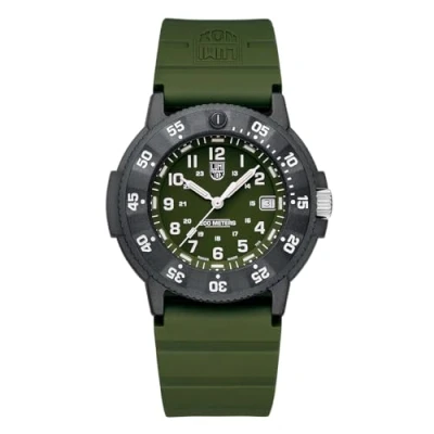 The stylish men's watch from Luminox is a real eye-catcher and can be worn with any outfit The high-quality green rubber strap with the pin buckle fits comfortably on the wrist The green dial with the hands is protected by high-quality sapphire glass The 13 mm thick black stainless steel case has a diameter of 43.00 The watch has a water resistance of 20 bar. The watch is suitable for snorkelling and device-free freediving at shallow depths