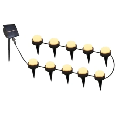 Solar LED mini spotlights: Solray is a set of 10 mini solar spotlights to be staked in the ground or to be fixed on a wall, it has an operating time of 8 hours. These linked mini spotlights will mark your outdoor area discreetly. The SOLIRAY Mini Solar Spot Light Set is a soft solar outdoor lighting that will allow you to decorate your garden or simply mark a pathway, all thanks to the energy of the sun. Outdoor use: the mini solar spotlights are pricked into the ground. You just need to plant them in a planter or on a lawn and the sun will do the rest of the work! The spikes are removable allowing you to attach the mini spotlights to a wall. Battery life: after charging about 6-8 hours, these solar lights can light up your patio or driveway for almost 8 hours. Don't be afraid to take the paths of your garden after dark, SOLIRAY will guide you the way! INTENSITY: The mini solar spotlights have a warm white LED base. This outdoor light offers you a very soft and warm lighting. ROBUST: Soliray outdoor solar signage protected against splashes (IP65) and also UV resistant.