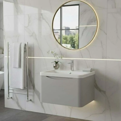 General description The Nuie Lunar Wall Hung 1-Drawer Vanity Unit with Ceramic Basin is a stylish and functional addition to any bathroom. With its modern design featuring recessed drawer handles in a crescent shape, this vanity unit offers a sleek and contemporary look. The satin grey finish provides a soft contrast against the white ceramics, making it a versatile choice for various bathroom styles. Technical specifications Total Height (Unit + Basin): 399mm Total Width (Unit + Basin): 610mm Total Depth (Unit + Basin): 460mm Unit Height: 359mm Unit Width: 596mm Unit Depth: 445mm Basin Width: 610mm Basin Depth/Projection: 460mm Basin Profile/Height: 40mm Weight: 34.32kg Basin Type: Ceramic Basin Shape: Soft Rectangular Basin Tap Holes: 1 (Central) Overflow: Included Cabinet Material: MFC Fascia Material: MFC Painted Matt Colour/Finish: Satin Grey Compatibility and accessories Compatible with matching tall units and WC units in the Lunar collection Taps, traps, and waste are sold