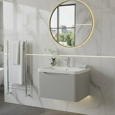 General description The Nuie Lunar Wall Hung 1-Drawer Vanity Unit with Polymarble Basin is a stylish and practical addition to any contemporary bathroom. Featuring a modern design with recessed drawer handles in a crescent shape, this unit is available in a chic satin grey finish. The innovative wall-hung design optimizes floor space, providing a clean and uncluttered look. Technical specifications Total Height (Unit + Basin): 399mm Total Width (Unit + Basin): 600mm Total Depth (Unit + Basin): 450mm Unit Height: 359mm Unit Width: 596mm Unit Depth: 445mm Basin Width: 600mm Basin Depth/Projection: 450mm Basin Profile/Height: 40mm Weight: 34.32kg Material: MFC and MDF Basin Type: Polymarble Basin Shape: Soft Rectangular Basin Tap Holes: 1 (Central) Overflow: Yes Compatibility and accessories Compatible with matching tall units and WC units in the Lunar collection Taps, traps, and waste are sold separately Installation Vanity unit supplied rigid - no assembly required on the