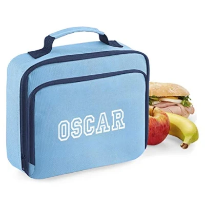 Fully Insulated - Lunch Cooler Bag printed with Name This fully insulated lunch bag is suitable for both school and work. Heavy duty 600D woven polyester with wipe clean interior, two zippered compartments and easy carry handle. Size: 24cm x 20cm x 8cm. Choice of Black, Navy, Sky Blue or Pink, Manufacturer: Nametape Express