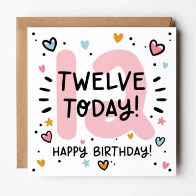 Lunella Stationery 12th Birthday Card for Her Pink Cute & Trendy Design Blank Inside With Kraft Envelope (Age 12)
