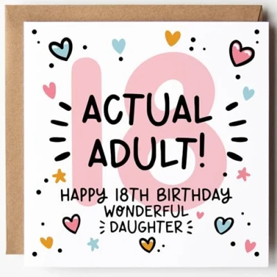 ACTUAL ADULT! - Celebrate a milestone moment with this bold and funny 18th birthday card for your wonderful daughter – she's officially an adult! All cards are printed on premium 350gsm FSC certified white card and come paired with a ribbed Kraft envelope. Blank inside, they offer space for your own message. Designed & Printed in the UK - Created by Lunella Stationery, a proudly independent British brand.