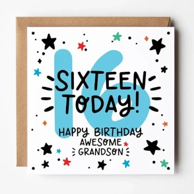 Sweet Today! - Celebrate a milestone moment with this bold and cheerful sixteenth 16th birthday card for your awesome grandson! All cards are printed on premium 350gsm FSC certified white card and come paired with a ribbed Kraft envelope. Blank inside, they offer space for your own message. Designed & Printed in the UK - Created by Lunella Stationery, a proudly independent British brand.