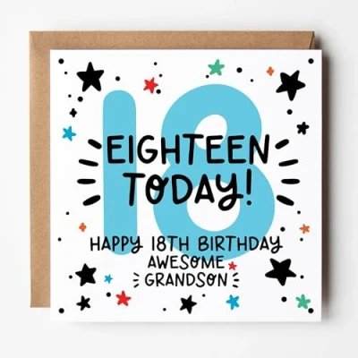 EIGHTEEN TODAY! - Celebrate a milestone moment with this bold and cheerful 18th birthday card for your awesome grandson – he's officially an adult! All cards are printed on premium 350gsm FSC certified white card and come paired with a ribbed Kraft envelope. Blank inside, they offer space for your own message. Designed & Printed in the UK - Created by Lunella Stationery, a proudly independent British brand.