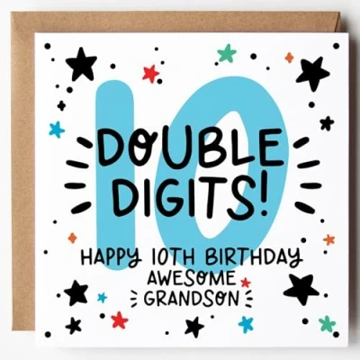 Grandson 10 Double Digits! - Celebrate a milestone moment with this bold and cheerful 10th birthday card for your awesome grandson – he's officially 10! All cards are printed on premium 350gsm FSC certified white card and come paired with a ribbed Kraft envelope. Blank inside, they offer space for your own message. Designed & Printed in the UK - Created by Lunella Stationery, a proudly independent British brand.
