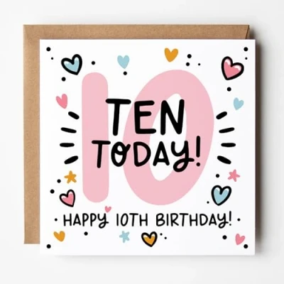 Celebrate her 10th Birthday with this cheerful birthday card, featuring a bold “10” and a fun, modern design. It’s the perfect card for a girl hitting double digits and celebrating this exciting milestone! All cards are printed on premium 350gsm FSC certified white card and come paired with a ribbed Kraft envelope. Blank inside, they offer space for your own message. Designed & Printed in the UK - Created by Lunella Stationery, a proudly independent British brand.