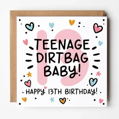 Lunella Stationery Happy 13th Birthday Card for Her Fun Teenage Dirtbag Baby! Age 13 Cute & Trendy Design Blank Inside With Kraft Envelope (Teenage Dirtbag)