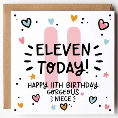 Lunella Stationery Niece Birthday 11th Card Cute & Trendy Design Blank Inside With Kraft Envelope Age 11 (Eleven Today)