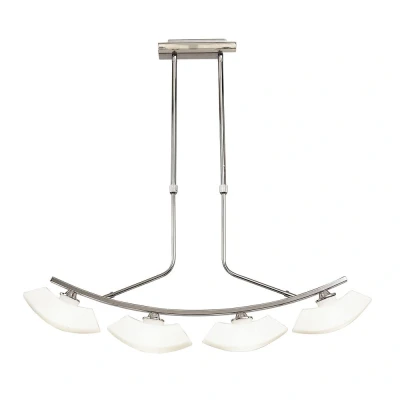 Introducing the Lupa Telescopic Pendant Curved Linear Bar 4 Light, a stylish addition to any home. This fixture features frosted glass shades and a sleek design, providing both beauty and functionality in your lighting choices.