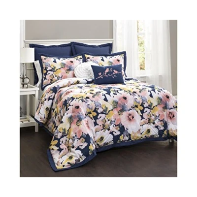 Floral Beddin Set: Add colorful, blooming florals to your bedroom with the Lush Decor Floral Watercolor Comforter Set. Designed with a watercolor floral pattern and decorated with a solid flange border, it adds the feeling of spring to your space. Charming Style: This floral bedding adds color and softness to any primary, guest, or teen bedroom. The mix of watercolor florals and navy accents complements cottage, vintage, and traditional decor for a fresh and beautifully finished look. Complete Bedding Set: This 7 piece full/ queen size bedding set includes: 1 comforter 90"W x 92"L, 2 standard shams 26"W x 20"L + 2" Flange, 2 euro shams 26"W x 26"L + 2" Flange, and 2 decorative pillows 18"W x 12"L and 16" round. Versatile Comfort: Crafted from 100% cotton fabric front and soft microfiber back, this floral bedding set offers both softness and comfort. The medium-weight polyfill filling of this bedding comforter sets is perfect for any season. Easy Care: Caring for this bedding set is easy, simply machine wash cold on the gentle cycle and tumble dry low. If needed, use non-chlorine bleach for cleaning or an iron on low heat to release wrinkles. About Us: Lush Decor crafts beautiful home decor for every room, style and age. Our luxury-for-less styles are designed to inspire. From timeless neutrals, rich textures and vibrant colors, we help you dress your space to reflect your personal style. Lush Decor: Woman Founded, Women Led Brand