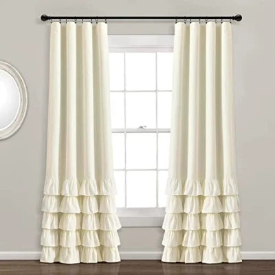 Enhance the elegance of any room when you add this blackout ruffled curtain panel. The layers flow beautifully, creating a feminine textured look. This panel is energy efficient, blocking out light, outside noise, and regulating your home's temperature. Teenagers and young adults especially love this stylish ruffled blackout window curtain set. But they are elegant enough to be used by any age, and in any room. Some great features of a 100% lined blackout window panel include bocking out light, temperature regulation for energy efficiency, and helping to reduce outside noise. Not only are you assured to have complete privacy, but this off-white lining meets most HOA requirements as well. This curtain set is sold by the single panel. Each panel measures 40 inches wide. You have two options for hanging this window curtain Panel set, as it is made with a 3" rod pocket. Hang them by sliding the curtain rod through the rod pocket or by using clips to hang the panels from the rod. Please follow care instructions found on label before washing.