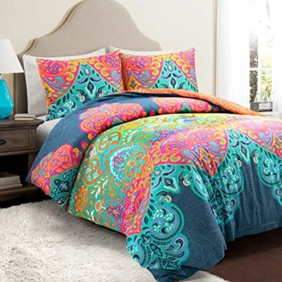 Celebrate the bold and colorful side of boho style with this vibrant cotton duvet cover set. The paisley-inspired design draws you in with its swirling shades and artistic detailing. This 3-piece duvet cover set is STANDARD 100 by OEKO-TEX certified. The alluring artistry of this reversible cotton duvet cover will become the center focus of your boho hideaway. Take advantage of the jewel tone colors to inspire the rest of your maximalist bedroom design. Express your creative side when you style your bedding using the reverse paisley pattern. Each night, you can drift away snuggled up in cozy 100% cotton fabric. Easily secure the duvet with the button closures and use the four internal corner ties to keep your comforter in place. This set includes 1 duvet cover and 2 matching shams. This product is STANDARD 100 by OEKO-TEX certified, which means the fabric, dyes and all components have been tested in an independent laboratory and certified against a list of more than 350 harmful substances. Please refer to label for full care instructions.