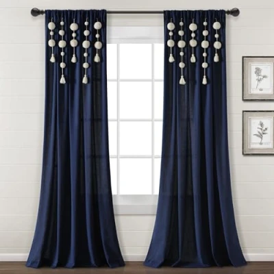Lush Decor Boho Pom Tassel Linen Window Curtain Panel (Single Panel), 95" L x 52" W, Navy