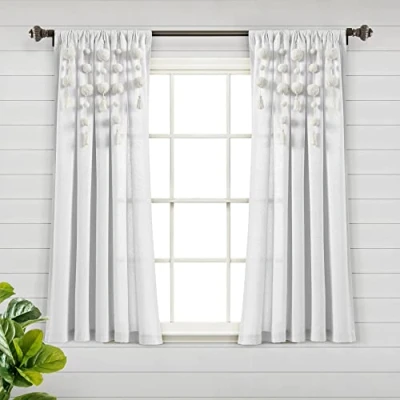 Boho Curtains: Add playful charm and soft textures to your window decor with the Lush Decor Boho Pom Pom Tassel Linen Textured Curtains. Designed with linen-textured fabric and removable pom pom tassels, these curtains bring bohemian flair to your home. Light Filtration: These light filtering curtains for bedroom provide moderate privacy while helping to filter sunlight, allowing a soft glow to fill the space. Window Curtains: Sold as a single panel measuring 52 inches wide by 63 inches long. These short curtains for living room are crafted from a linen-textured cotton blend fabric for a rustic feel. Easy to Install: This window panel set offer seamless installation with its 3" rod pocket, easily slide it onto your curtain rod or by using clip rings (not included). Easy Care: To care for this window curtain, simply machine wash separately in cold water on the gentle cycle and tumble dry low. Use an iron on low heat to release wrinkles if needed. Remove Pom Poms before washing. About Us: Lush Decor crafts beautiful home decor for every room, style and age. Our luxury-for-less styles are designed to inspire. From timeless neutrals, rich textures and vibrant colors, we help you dress your space to reflect your personal style. Lush Decor: Woman Founded, Women Led Brand