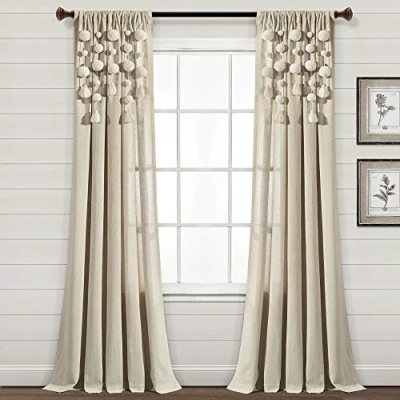 AmazonBOHO CURTAINS Add playful charm and soft textures to your window decor with the Lush Decor Boho Pom Pom Tassel Curtains. Designed with linen textured fabric and removable pom pom tassels, these curtains bring bohemian flair to your home. LIGHT FILTRATION These light filtering curtains for bedroom provide moderate privacy while helping to filter sunlight so a gentle glow fills the room. WINDOW CURTAINS Sold as a single panel measuring 52 " wide by 95 " long. These long curtains for living room are crafted from a linen texture cotton blend for a rustic feel. 【Easy to Install】This window panel set provides seamless installation with its 3 inch rod pocket, easily onto your curtain rod or with the help of clip rings (not included). Easy care: To care for this window curtain, simply wash it separately in cold water on a gentle cycle and dry it at low temperature. Use an iron on low heat to loosen wrinkles if necessary. Remove the pom poms before washing. About Us Lush Decor makes beautiful home decor for every room, style and age. Our luxury for less styles are meant to inspire. From timeless, neutral, rich textures and vibrant colors, we help you design your space to reflect your personal style. Lush Decor: Founded by woman, women's brand