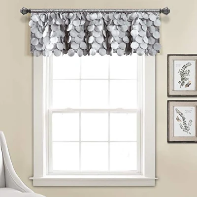 Elegant, simple design with layered, hand stitched circles adorn this window curtain valance. Lush Décor Gigi kitchen window valance is the ideal curtain for your modern or traditional style decor. Sold as a single curtain valance and perfect to brighten any bedroom, living room or dining room window. 100% polyester curtain with a textured, layered design. Measures 14” H x 70” W and has a 1. 5” rod pocket for easy installation. Due to the delicate embroidery and design, this item is dry clean only.
