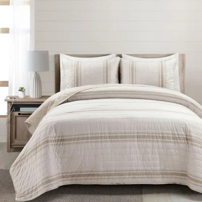 Farmhouse Chic: Decorate your bedroom with our charming Farmhouse Stripe Reversible Quilt Set, perfect for all ages. The front design is reminiscent of shiplap beams, with a pattern of thin and thick colored stripes on a cream background. Versatile Design: Enjoy two stylish looks in one set! Simply flip this set over to reveal a classic pinstripe pattern. Switch up your primary, guest, or teen's bedroom or dorm decor as often as you'd like with this modern farmhouse reversible quilt set. Complete Bedding Set: This 3 piece full/queen bedding set includes: 1 quilt 88" W x 92" L and 2 standard pillow shams 26" W x 20" L. Fans of modern farmhouse will love this bedding, but it works in other decor themes like traditional, coastal, or cottage. Versatile Comfort: Our soft reversible quilt has a 100% cotton fabric front, and microfiber back. The cotton/poly blend filling is perfect for hot sleepers and great as an extra layer for those cold sleepers who layer-up to keep warm. Easy Care: Designed for effortless maintenance, it's easy to care for our Farmhouse Stripe Quilt Set so it remains a staple in your bedroom for years to come. Simply machine wash cold on a gentle cycle and tumble dry on low. Iron on low heat if needed. About Us: Lush Decor crafts beautiful home decor for every room, style and age. Our luxury-for-less styles are designed to inspire. From timeless neutrals, rich textures and vibrant colors, we help you dress your space to reflect your personal style. Lush Decor: Woman Founded, Women Led Brand