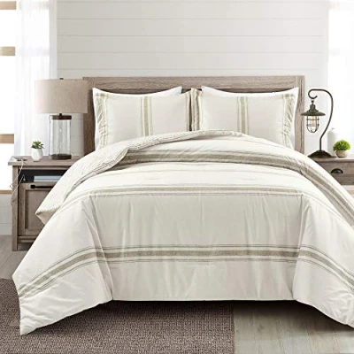 Lush Decor Farmhouse Stripe Reversible Cotton 3 Piece Comforter Set, Neutral, King