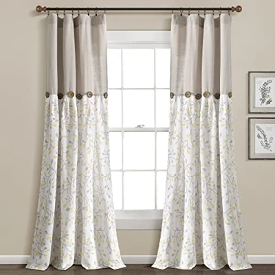Lush Decor Linen Button Botanical Garden Window Curtain Panel (Single Panel), 84" L X 40" W, Gray & Yellow