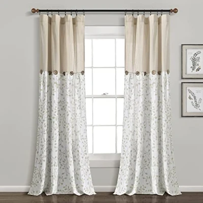 Lush Decor Linen Button Botanical Garden Window Curtain Panel (Single Panel), 84" L X 40" W, Neutral & Green