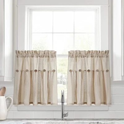 Modern Farmhouse: Elevate your home decor with our charming Linen Button Kitchen Tiers. This 2 panel set is great for farmhouse decor, adding the look of linen, with a modern color block design and coconut husk button details for window treatments. Kitchen Tier Set: These linen kitchen curtains help to filter sunlight, allowing a soft glow to shine through, creating a warm and welcoming atmosphere. This curtain set includes 2 panels, each measuring 24 inches wide by 29 inches long. Linen Textured: These window curtain panels are crafted from a linen-like cotton fabric blend of 52% Polyester, 37% Cotton, 8% Viscose. The 5 coconut husk buttons add a unique touch to your space while providing a handcrafted feel. Easy Installation: These kitchen curtains sets for windows offer seamless installation with their 3" rod pocket, allowing you to easily slide onto your curtain rod, or by using clip rings (not included). Easy Care: These kitchen curtains for windows are easy to care for, simply machine wash cold on a gentle cycle and tumble dry on low. If needed, use an iron on low heat to remove wrinkles, or a non-chlorine bleach for cleaning. ABOUT US: Lush Decor crafts beautiful home decor for every room, style, and age. Our designs blend modern luxury with everyday comfort, made to inspire. From rich textures, vibrant hues, and timeless patterns—create a home that feels uniquely yours. Lush Decor: Woman Founded, Women Led Brand
