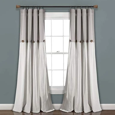 Lush Decor Linen Button Window Curtain Panel, Single, 40" W x 95" L, Gray & White Country Curtains Rustic Color Block Modern Farmhouse For Living Room, Bedroom Dining Room