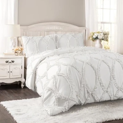 Coquette Comforters: This Avon Comforter Set has a frilly ruffle ribbon detail that adds a feminine touch to your bedroom decor. The perfect choice for those who love farmhouse, Parisian chic, Coquette, French Country, or elegant vintage styles. Ruffled Bedding Set: Wrap yourself in the soft textured bliss of this comforter set queen size. The solid neutral colors and pattern of ruffles makes this queen bedding set the charming focal point of your vintage bedroom decor. Complete Bedding Set: This 3 piece full/ queen size bedding set includes 1 comforter 92" W x 96" L, and 2 standard pillow shams 26" W x 20" L. Versatile Comfort: This textured bedding set is crafted from microfiber, offering softness and breathability. The medium-weight polyfill keeps you warm and cozy all year long. This bedding set is STANDARD 100 by OEKO-TEX certified, all components have been tested and certified free from harmful substances. Easy Care: Caring for this ruffle bedding is easy. Simply machine wash cold on the gentle cycle and tumble dry low. Do not iron. Use a steamer to release wrinkles. About Us: Lush Decor crafts beautiful home decor for every room, style and age. Our luxury-for-less styles are designed to inspire. From timeless neutrals, rich textures and vibrant colors, we help you dress your space to reflect your personal style. Lush Decor: Woman Founded, Women Led Brand