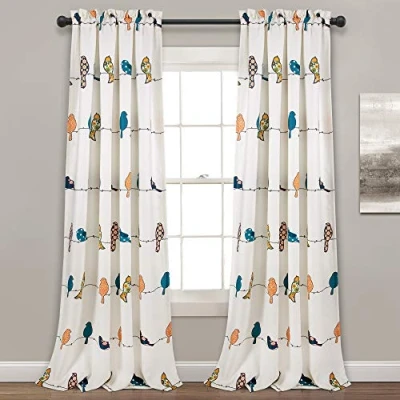 Room darkening window curtains filter a portion of light and heat, but allow for some natural light to come through. Calming, unique window panels with colorful birds sitting on wires adorning each curtain. 100% polyester window curtain panels. Curtains are not lined and have a 3” rod pocket, each panel measure 95 x 52 inches with a 2” header. Lush Décor Rowley Birds curtains feature a delicate design for your bohemian or traditional style bedroom, living room or dining room windows. Easy to care for and safe to machine wash cold in a mesh laundry bag, gentle cycle and tumble dry low.