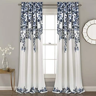 Lush Decor Tanisha Curtains Light Filtering Window Panel Set, Pair Floral Vine Print, Beautiful, Modern, Elegant Home 52" W x 84" L, Navy & White