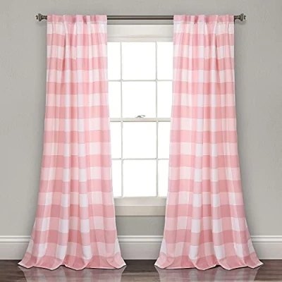 Stylish and decorative plaid, gingham patterned navy curtains ideal for your country or farmhouse style decor. Lush Décor Kelly Checker 2 panel curtain set feature a checkered design for your bedroom, living room or dining room windows. Room darkening window curtains filter a portion of light and heat, but allow for some natural light to come through. Window curtain panels made of 100% polyester. Each panel measure 84 x 52 inches and a 3” back tab pocket allows for multiple installation options. Easy to care for and safe to machine wash cold in a mesh laundry bag, gentle cycle and line dry.