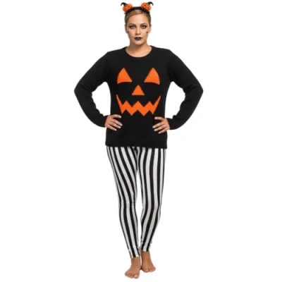 LUXE DIVA Pumpkin Face Knitted Halloween Jumper for Women in Black & Orange Round Neck Long Sleeve Top Women's Ladies Plus Size Sweater UK 8 22