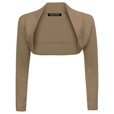LUXE DIVA Womens Plain Long Sleeve Bolero Shrug Crop Top Ladies Cropped Cardigan Tops UK 8 26 Mocha