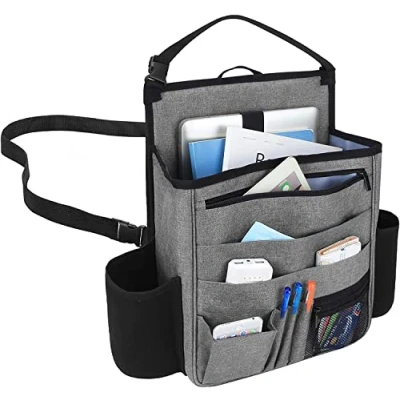 GREAT QUALITY: Made of high-grade Oxford Polyester, water resistant and abrasion resistant. Soft padded lining on the main pocket which protects your laptop, tablet, folder and the like. HEAVY-DUTY: Reinforced back support, strong buckles and long adjustable straps (up to 39 inches) to ensure your stuff remains in place. Back adjustable straps make it easy to secure in your car. SEVERAL COMPARTMENTS: A protective neoprene sleeve for securing your laptop. A large main compartment for storing clipboard, books or tablet. 2 neoprene holders on the side work great for bottles. 3 slots to store pens and pencils. 6 pockets of different sizes for small tools like electronic products, labels, tissues, etc. CONVENINET: Reinforced grab handle on top and adjustable straps make it easy to move this car seat organiser to and from your vehicle. DIMENSIONS: 32 CM (W) x 42 CM (H). This cart seat organiser makes your trunk look clean and organized.
