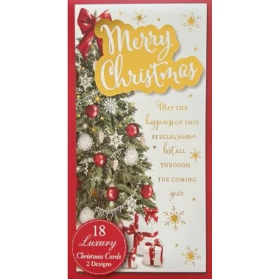 🎄 Luxury Christmas Cards Multipack – Includes 18 high-quality greeting cards with envelopes. ✨ Foil Embossed Finish – Elegant metallic details add a festive sparkle to each card. 🎁 2 Beautiful Designs – Featuring Christmas trees with presents in two festive variations. 💌 Greeting Inside – Pre-printed seasonal message makes sending Christmas wishes easy. 🎅 Perfect for All Occasions – Ideal as Christmas cards or Xmas cards for family, friends, colleagues, or customers.
