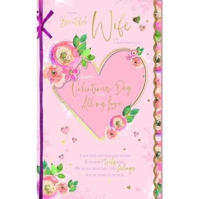 Luxury Handmade Valentine's Day Card 'To My Beautiful Wife' Heart And Flowers Design by Wishing Well Studios, 7 X 11 Inches