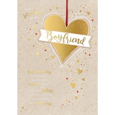 LUXURY HANDMADE VALENTINE'S DAY CARD - with generous gold foil and tied with a romantic red bow, this card is sure to bring a smile your boyfriend's face on this special day CARD MEASURES 7 X 10 INCHES (20 X 25 CMS) - this premium card is handmade using only the finest quality materials and includes a sturdy envelope ROMANTIC WORDS: the message on the front reads: 'With lots of love to my boyfriend, Valentine's Day is so special, there's no better occasion than this, to send you my feelings wrapped up in this card and sealed with a big loving kiss' and the message inside reads: 'You are simply everything a Valentine should be, special, gorgeous and sexy, you're the only one for me! With all my love this Valentine's' INSIDE ALSO ILLUSTRATED - open the card to reveal a red border and red and gold hearts, with plenty of space for your own loving message DESIGNED BY WISHING WELL STUDIOS - our unique, high-quality cards are created in the UK to mark every occasion, whatever the season.