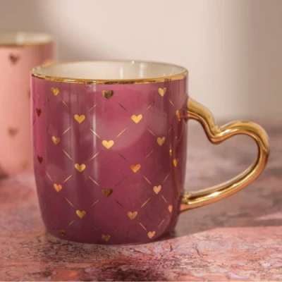Add elegance to your drinkware with this 350ml luxury ceramic mug, featuring a heart-shaped gold handle and romantic prints. A charming gift or personal indulgence in four beautiful designs.. 350ml capacity ideal for coffee, tea, or hot cocoa. Elegant heart-shaped gold handle and rim detailing. Glossy ceramic finish with gold heart or “Love” prints. Available in 4 romantic colour and pattern combinations. Perfect for Valentine’s, anniversaries, or self-care sips. Material: Glazed ceramic with gold-effect handle. Dimensions: Approx. 9cm (H) x 8cm (D). Care Instructions: Hand wash only.. Not microwave safe due to metallic finish