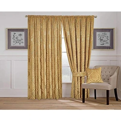 Luxury Heavy Jacquard Pencil Pleat Curtains Fully Lined + Matching Tiebacks Gold 90 x 72