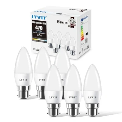 LVWIT B22 LED Candle Bayonet Bulbs,4.5W Bulbs, 40W Bulb Equivalent,6500K Cool White Cap, 470Lm, 200 Degree Beam Angle,220 240V,Non Dimmable (Pack of 6)