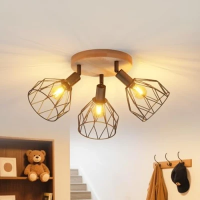 ceiling light fixtures offers E14 sockets and is designed for LED bulbs. Suitable as well for conventional bulbs of 40Watt max (heat dissipation of light bulbs easy and not effect bulbs usage lifespan) 3 spotlight ceiling light :High Quality Material The spot lights ceiling is made of high quality Wood+Iron ,which features rust-resistant, durable and sturdy. Rotatable and Adjustable:LED ceiling light fitting heads can be vertically rotated to 180° and horizontally rotated to 350°. Three swing arms with adjustable lights allow you to DIY the light direction to customize your own lighting effects and illuminate the desired part of your room. Black light shade Replaceable E14 Bulb: Choose your favorite E14 bulb (bulb not included). It is recommended to use LED bulbs no more than 40W. According to your personal needs, you can also choose dimmable bulbs or smart bulbs to get different mood lighting. Ceiling spotlights rotatable bulb base makes the installation diversified, this led ceiling spot lights can be used as ceiling light or wall light, also suitable for kitchens, living room, bedroom, hallway.