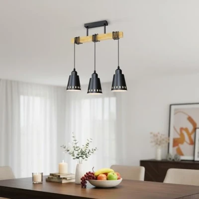 LVWIT Black Hanging Lights,Kitchen Island Lights,Pendant Lighting,Wood Ceiling Light Fitting,3 Way Drop Lights Ceiling,Industrial for Lving and Dining Room(E27 Base,NO Bulbs)