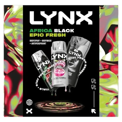 LYNX All Stars Trio Gift Set includes a full-size LYNX Africa Body Spray, Epic Fresh Antiperspirant, and Black Body Wash LYNX Africa Body Spray 150 ml keeps him smelling irresistibly fresh for longer with a squeezed mandarin and sandalwood fragrance LYNX Black Body Wash 225 ml allows him to make an impression without going over the top with a refreshing frozen pear and cedarwood fragrance LYNX Epic Fresh Antiperspirant 150 ml features a 100% amazing fragrance with a sensational scent of grapefruit & tropical pineapple Perfect for any occasion, these gifts for him are the ultimate Father’s Day present, secret Santa surprise or all-year-round gift Our gift set is packaged in a 100% recyclable gift box